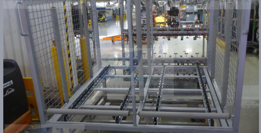 Zváraná konštrukcia s valčekovou traťou slúžiaca na prepravu rezervných kolies pre automobilový priemysel. Jednotlivé palety ja možné na seba stohovať.