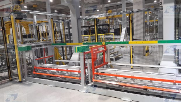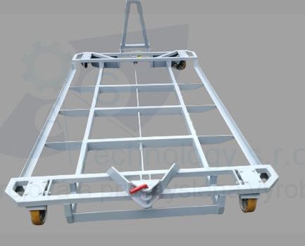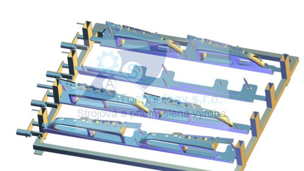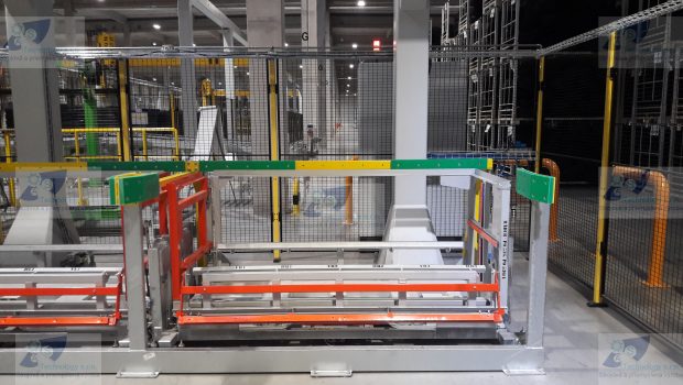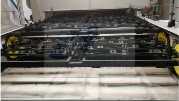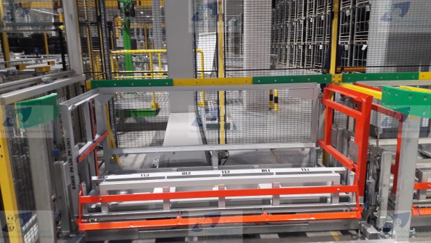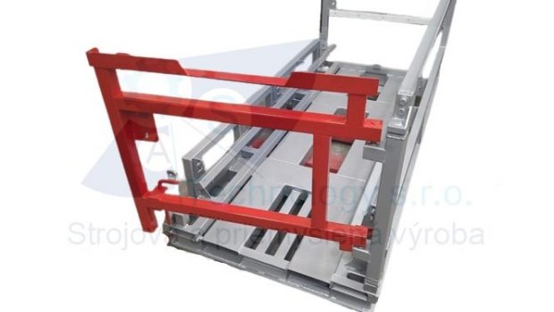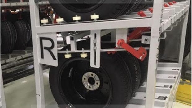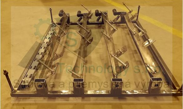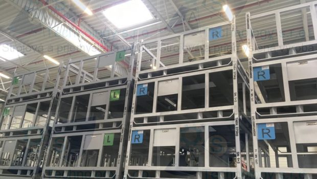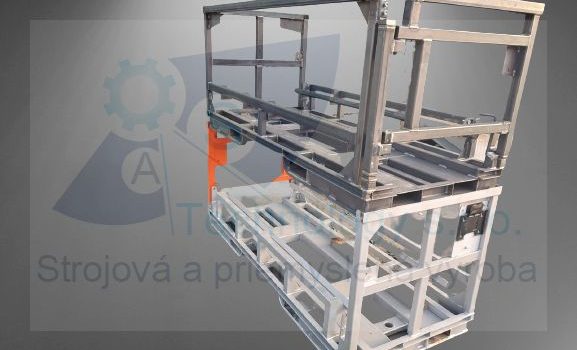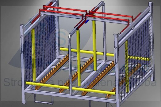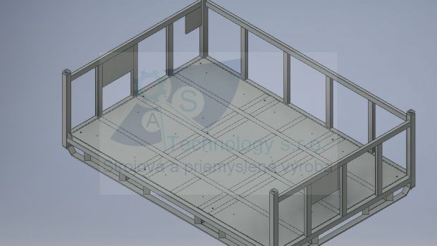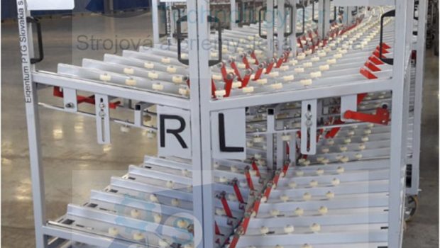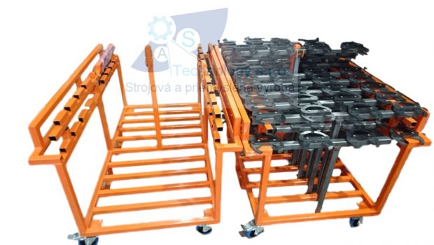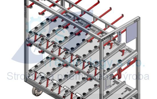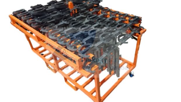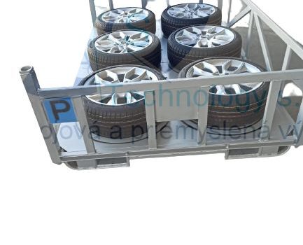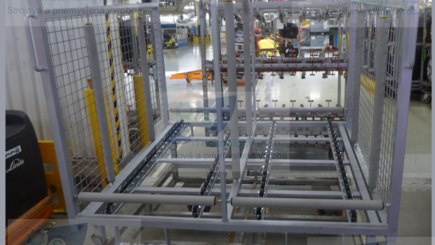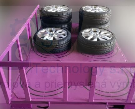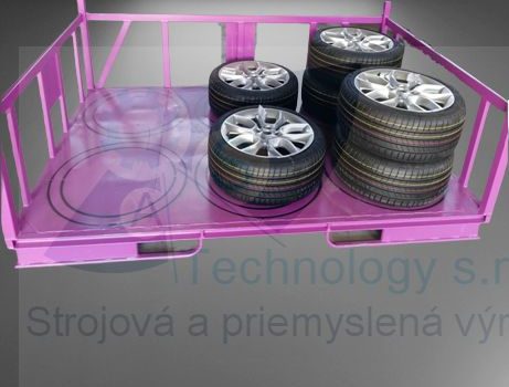 Zváraná konštrukcia s valčekovou traťou slúžiaca na prepravu rezervných kolies pre automobilový priemysel. Jednotlivé palety ja možné na seba stohovať.